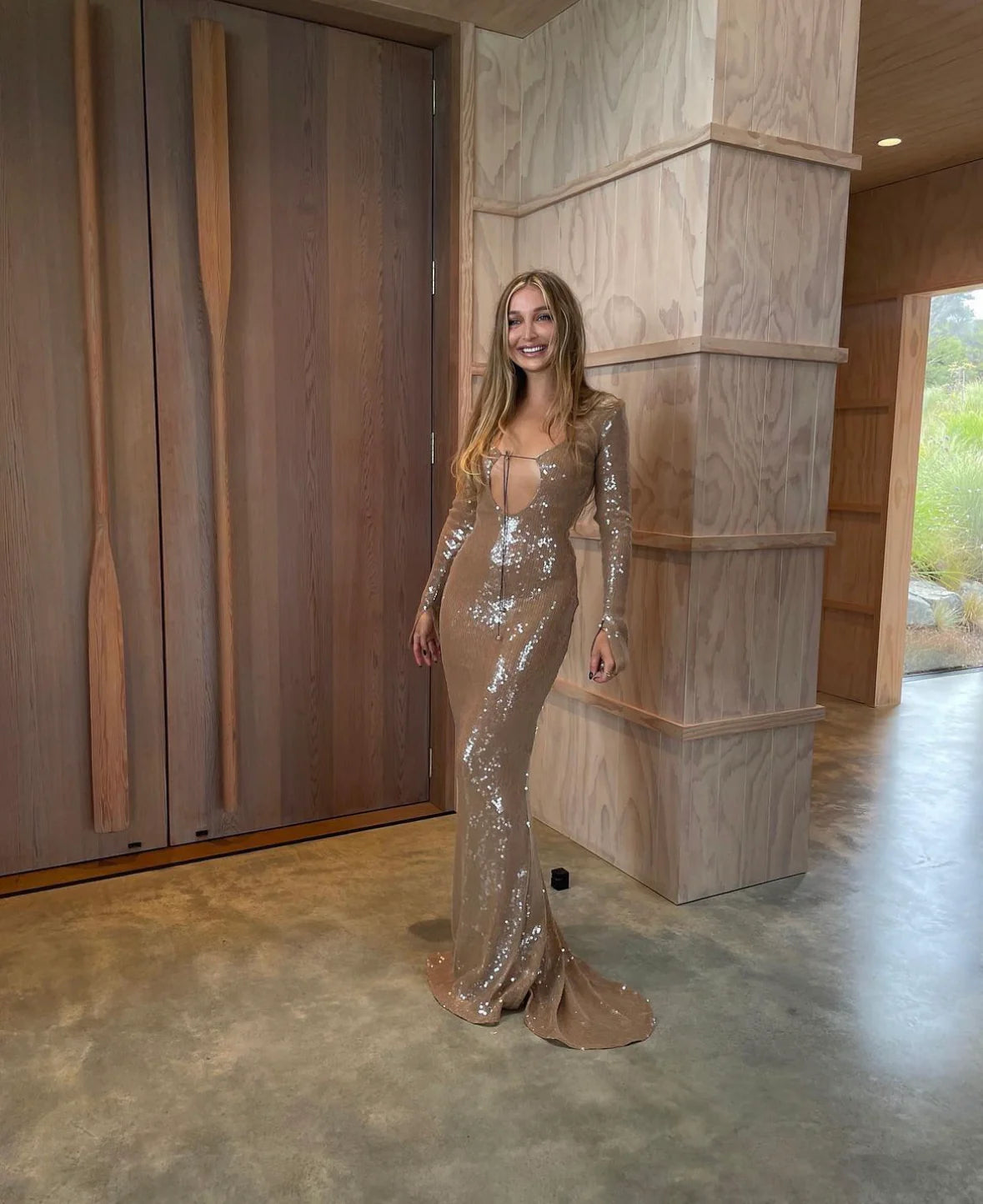 The Solaris Gown in Smoke Sequin features a keyhole cutout neckline with an adjustable drawstring closure in the front and back, offset with signature 16arlington extended sleeves. Cut in a slim fit with a slight stretch it is designed to be pulled over the head. This dress is fitted with a soft touch slip dress and has no itchy/scratch feel.