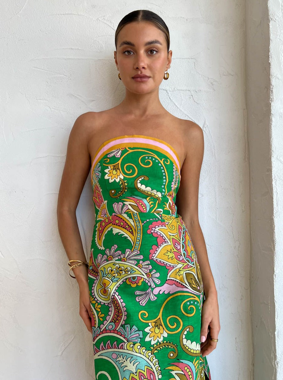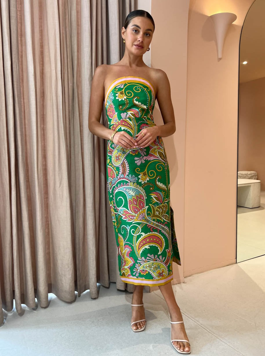 Crafted from a Silk Linen blend fabrication, this flattering strapless midi dress features a curved neckline, fitted bodice with structured boning and an elasticated back.